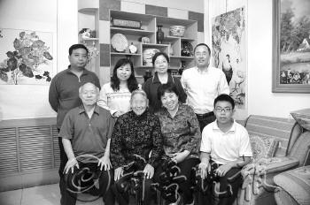 89岁的丁宝英老人(前排左二)跟69岁的女儿李世梅一家生活在一起。“我这么大岁数,还能喊声妈,真的很幸福。”李世梅说。 本报记者 王媛 摄