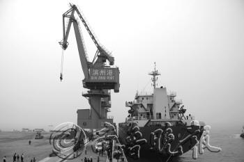 | 万吨货船顺利靠岸,标志滨州万吨港试通航成功。 本报记者 王晓霜 摄 |