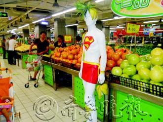 时间:2013年10月8日 自述:某超市的水果摊位前,有一个超人打扮的模特很拉风,头上戴着柚子皮帽,“身体”很多地方都被扮上了柚子皮。 点评:如此打扮,挺拉风。