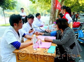 13日,在百脉泉广场,8家医疗机构派出专家为市民义诊,为期一周的大型义诊活动开幕。从今年开始,以后每年10月份的第三周都会举办义诊周。
