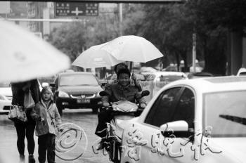 东方红路上,雨中的市民撑着雨伞。 本报记者 马志勇 摄
