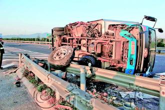 低头捡手机大货撞护栏