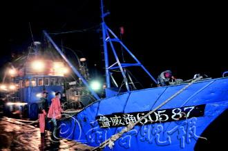 ▲14日晚,为躲避风浪,渔船靠港后,渔民在加固渔船。 记者 王震 摄