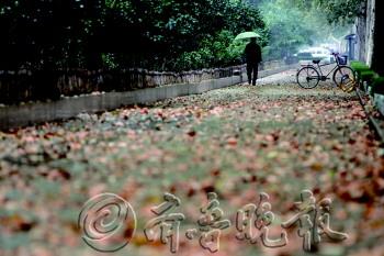 寒秋 14日一早,伴随着淅淅小雨和瑟瑟北风,张店柳泉路人行道两旁铺满了枯黄的落叶。骤降的气温让市民感叹冬意已悄然到来。记者从市气象台获悉,15日起天气放晴,未来三天天气晴好,但气温不会有明显回升,市民需做好防寒保暖措施。 本报记者 王鑫 摄影报道