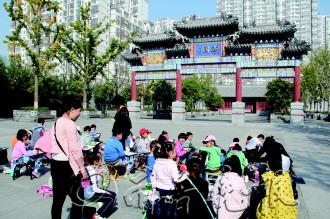 13日上午10点,三十余名小学生在滕州市九州清晏小区前,用手中的画笔描绘仿古建筑“善国门”。绘画老师表示,带学生来写生既训练了学生的造型能力,又能加深对滕州文化的了解。 本报记者 殷悦 摄影报道