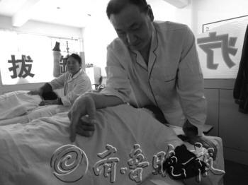 聂明聚正在给一位颈椎疼痛的客户做按摩。    本报记者 秦昕 摄