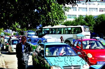 15日上午,在向阳大街客车进站口,出租车等载客车辆拥在门外,给过往车辆及行人带来诸多不便。 本报记者 王小会 摄