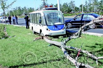本报10月15日讯(记者 吕修全 通讯员 吴俊平) 15日上午,南海新区现代路6号桥西发生一起单方事故。一辆标有“卓达·香水海”字样的电动观光车违章上路,右前轮突然爆胎致车辆失控,撞倒路边三棵树,司机将赔偿园林部门近万元的苗木损毁费。 15日上午10时30分许,文登交警大队二中队民警接到110指挥中心指令,称在南海新区现代路6号桥西发生一起车辆单方事故。民警迅速赶到现场查看,发现一辆电动观光车冲进路边绿化带,撞倒三棵树后才停下。 司机承认,自己驾电动观光车自园区驶出办事,因车速较快,右前轮突然爆胎,车辆失控歪向路边,在撞歪5段路沿石后,又撞倒三棵行道树后才停下。电动观光车前风挡玻璃被撞龟裂,所幸司机伤无大碍。 民警调查,该车曾有驶出园区、上路行驶的违章记录,司机将面临相应处罚。电动观光车撞倒的三棵行道树均系名贵树种,司机将被赔偿园林部门近万元的树木损失费用。