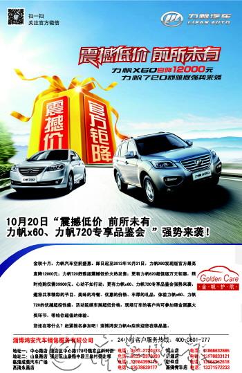 震撼低价 前所未有——力帆X60、力帆720专享品鉴会将于今年10月20日在淄博鸿安力帆4S店内举行。诚邀广大车友朋友一起来感受力帆X60、力帆720的无穷乐趣,体验力帆X60、力帆720的优越超控性能,活动期间购力帆汽车可参加砸金蛋抽大奖的活动,力帆320,520,520i,620还可以享受力帆汽车延续“3000元惠民补贴”的优惠政策! 力帆X60在自主品牌SUV车型中率先搭载了1.8CVVT全铝发动机,采用同级车中最先进的VVT-i技术,最大功率98kw,经济燃油性比普通发动机提高了10%-15%。力帆X60整体车型采用了轻量化设计,降低了汽油损耗,节能省油表现更加突出。 力帆X60采用大嘴造型,进气格栅盾牌式造型,倒的U字型结构更符合当下的流行元素。车头给人的感觉很震撼,镀铬中网给人眼前一亮的感觉,与鹰眼式大灯看起来很搭调。车身尺寸方面,力帆X60长宽高分别为4325mm*1790mm*1690mm,轴距达到了2600mm,定位于紧凑型SUV。 力帆720搭载着1.8L CVVT全铝发动机,动力强、油耗低,具有可变进气门技术,峰值扭矩为159牛米,最大功率94.3千瓦,百公里综合油耗为7.9L,动力充沛的同时更是兼具燃油经济性。 力帆720在车内N.V.H静音优化设计方面独具匠心。车身顶篷、四门内护板,仪表板内等多处采用了各种吸、阻、隔音等减震降噪材质和技术。经过NVH的综合优化,力帆720怠速时车内噪音为40分贝,时速100公里车内噪音为65分贝,车内噪音和舒适度可媲美合资品牌水平。 本次专享品鉴会,您不仅会享受到购车最优惠的政策,还可以在店内参加各种互动游戏,赢取更多精美的互动礼品。精彩的节目、美味的冷餐、优惠的价格、丰厚的礼品,您还在等什么,赶快报名参加吧! 淄博鸿安力帆4S店 中心路店:张店中心路178号魏家庄斜对面 山泉路店:张店山泉路中段三泉村委北邻