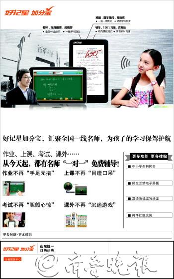 纯净社区交流,创造浓厚的学习氛围,远离不良信息。好记星加分宝,就是孩子的“良师益友”! ●名卷透视 ●知识搜索 ●课本点读 ●商城海量应用 ●高清晰摄像头 ●Wifi ●蓝牙 400-0528-567 现在订购即可获赠价值300元无线路由器(数量有限,送完即止) 山东销售中心: 济南泉城路新华书店二楼 ◎济南泉城路新华书店二楼 ◎德州新华书店 ◎德州百货大楼 ◎夏津大鹏影库 ◎武城联华超市 ◎张店新华书店二楼 ◎周村新华书店 ◎淄川银座 ◎临淄东泰广场七楼 ◎泰安龙潭路好记星专卖店 ◎东平好记星专卖店 ◎肥城好记星专卖店 ◎新泰银座四楼好记星 ◎宁阳凌云七贤店 ◎潍坊中百电器一楼 ◎潍坊泰华城三楼 ◎临朐英才书店 ◎青州市佳乐家 ◎昌乐大华书店 ◎寿光市佳乐家 ◎高密好记星专卖店 ◎安丘好记星专卖店 ◎诸城昌城书店 ◎昌邑佳乐家 ◎菏泽银座四楼 ◎鄄城鄄三路家和超市 ◎郓城新华书店 ◎单县环亚商城府东店 ◎曹县新华书店 ◎日照大润发三楼 ◎五莲新玛特购物中心 ◎莒县新华书店一楼 ◎莱芜好记星专卖店 ◎莱芜银座二楼 ◎东营西城百祥电脑城 ◎广饶佳乐购物广场 ◎滨州银座中心店 ◎无棣新四路祥龙文具 ◎临沂新华书店二楼 ◎沂水新华书店二楼 ◎苍山开元国际商城二楼 ◎费县粮食局对面小天才玩具 ◎临沭新华书店一楼 ◎莒南隆山路303号好记星专卖店 ◎滕州小牛顿玩具各店 ◎聊城百大三联 ◎高唐天齐庙太平洋数码 ◎冠县一中对面创意书店 ◎茌平新华书店 ◎阳谷新华书店 ◎烟台三站科技市场 ◎黄县花木兰街新华书店三楼 ◎牟平政府街好记星体验中心 ◎文登利群商场一楼 ◎青岛香港中路书城二楼 ◎青岛即墨国美一楼 ◎青岛开发区长江利群三楼 ◎青岛胶州老利群一楼 ◎青岛莱西新华书店一楼