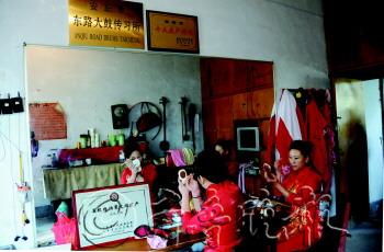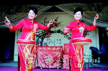 文\本报记者 李涛 片\本报记者 孙国祥 17日上午,在安丘青云山民俗游乐园齐鲁民俗村内,东路大鼓传承人丁淑红、丁丽华姐妹正在为观众演出安丘大鼓。 今年47岁的丁淑红年轻时在安丘市京剧团工作,一次偶然的机会让她和妹妹欣赏到了安丘大鼓演出。出于一种乐趣爱好,两人便开始利用业余时间学习安丘大鼓。 “一开始家里人都不支持,说这是不务正业。”无奈之下,姐妹俩用录音机录下来偷偷地带回家模仿练习。就这样,姐妹两一直到现在。2009年,东路大鼓被列入省级非物质文化遗产。2011年,丁淑红被确定为东路大鼓非遗传承人。自此以后,丁淑红和妹妹丁丽华的肩头上又多了一份责任,将东路大鼓(安丘大鼓)传承发扬下去。 丁淑红说,清末东路大鼓传入安丘,经过几代艺人加工努力,逐渐形成了独具体系和韵味的“安丘大鼓”,“安丘大鼓安丘味,满口腴腮真带劲”。一副支架、一个羊皮鼓、一个鼓槌、一对鸳鸯板,一个人敲着鼓、打着鸳鸯板、唱着曲子,这就是最原始的安丘大鼓的演唱形式。 而今历经百余年的发展,在艺人们的演唱实践中不断对唱腔进行加工和润色,并运用了新的曲牌,增加新的伴奏乐器,如坠琴、洋琴、笛子、二胡、琵琶、笙等,使安丘大鼓的唱腔和音乐日趋完善。如今,很多到安丘青云山民俗游乐园游玩的市民看到东路大鼓的演出后,纷纷前来学习观摩。丁淑红表示,每年她和她的队员们都会表演几百场,现在固定的学生也有二十余人。 锣鼓一响,字正腔圆。舞台上,沉寂了多年的安丘大鼓又回来了。 ① 化妆的地方略显简陋。 ② 每一次演出都忘情投入。 ③ 除了演奏传统曲目,剧团还自己编排一 些现代曲目进行演唱。 ④ 经过多年的表演磨合,姐妹俩在台上已 十分默契。 ⑤ 用到的道具十分的简单,一面鼓、一根竹 子做的鼓锤一副铜板。铜板上用手捏的 地方已经被磨得发亮。
