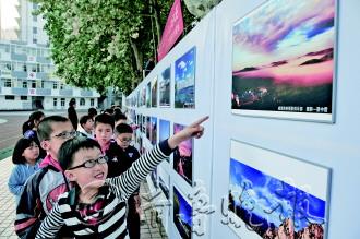 10月19日,鲸园小学将迎来建校111周年。19日-21日,威海环翠区教育摄影协会、威海海报摄影俱乐部联合在该小学举办摄影展。届时,将展出80幅作品。图为17日,工作人员将作品挂出供学生参观。