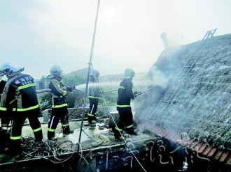 | 蓝天白云下,吴家疃村的海草房聚落。 |  | 7月8日16时33分,荣成宁津街道办事处林家流村一海草房起火。火灾起因是屋内液化气罐明火引燃屋顶海草。 |