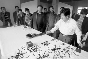 王滋麟: 愿在“为文”路上做 “有益天下”的报道 杨金镜:兴致大发题字,忘了笔会开始时间 原烟台市市长杨金镜出席了本次书画笔会。在笔会开场前,烟台市书法家协会主席宁兰智先生已经按捺不住兴致,在会场的办公区提前写下了一幅书法。 看到宁兰智现场题写之后,杨金镜先生也兴致大发,当场挥毫泼墨连续写下了5幅书法作品,这下现场的观众可过了瘾。 由于太过投入,杨金镜连笔会已经开始都没有注意到,直到在场的工作人员提醒,这才恋恋不舍地离开了字台。 提到这次笔会,杨金镜说:“这次的活动很好,给了烟台书画家们一个交流的机会。”看到《齐鲁晚报·今日烟台》携手众位烟台市书画家齐聚一堂,进行作品的展示以及现场交流,杨金镜非常高兴,这也是他连续写下5幅作品的原因之一。 本报记者 于涛 甲骨文之父王懿荣玄孙、中国甲骨文书法艺术协会理事王滋麟现场献上一副甲骨文对联:“今夕为文有益天下,明朝作事无愧子孙”,希望本报今后在“为文”的路上,能作更多有益于市民的报道,贴近老百姓的生活,做到“有益天下”。此外,他也想借着《齐鲁晚报·今日烟台》六周年的契机,祝愿本报能刊登更多更好的报道,以便后世更多人成为本报的忠实读者。 “红色也有寓意,证明这场合和活动重要。”王滋麟说,今天的笔会上他特意选用红色来书写,也是契合甲骨文中记录重要事件时才用红的典故,意在体现对本报活动的重视和支持。 宁兰智:买完菜第一件事就是看《齐鲁晚报》 于松石: 在重要的日子 送重要的诗词 烟台市书法家协会主席宁兰智先生在书画笔会的现场进行了致辞。在致辞中宁兰智盛赞《齐鲁晚报·今日烟台》举办的这次活动,并说自己是报纸的忠实读者,每天晨练回家第一件事就是阅读《齐鲁晚报》。 宁兰智说:“每次晨练之后,买完菜回家做的第一件事情就是打开报纸,看完之后再吃饭。”他说,《齐鲁晚报》可读性很高,“《齐鲁晚报》只要看上一个月就会上瘾。” 在阅读体验上,宁兰智认为《齐鲁晚报·今日烟台》对民情、民生的报道翔实可靠,舆论导向非常好,品味还很高,是一份“老百姓都爱看的好报纸”。 宁兰智在现场一口气写下了大字和小字共5幅书法送给了本报,除了用书法来表达祝福之外,他还在致辞中祝愿《齐鲁晚报·今日烟台》越办越好,在新闻报道和文化贡献上更上一层楼。 本报记者 于涛 王德志:愿《齐鲁晚报》继续为百姓发声 感念本报系列监督报道的力度,烟台市书法家协会副主席王德志现场写就多幅作品,以唐诗抒情希望本报在今后的日子里能一如既往地传递民声,为百姓排忧解难。 说起和本报的渊源,王德志一下打开了话匣子。“你们的报纸敢真正替老百姓说话和做事。”王德志说,他至今仍记得本报关于火车站附近打车难的系列报道,道出了市民最关注的民生问题不说,还一追到底,这样的报道力度深得民心,也让他记住了这份报纸。 “今天的笔会我写的多是唐诗,借此来祝福报纸越办越好。”王德志说,唐诗里的情怀也寄寓着他对本报的祝福。唯愿在今后的日子里,本报能继续贴近市民生活,反映市民心声,真正为老百姓排忧解难,他和亲友也将一如既往地支持本报。 本报记者 孙淑玉 20日下午,《齐鲁晚报·今日烟台》六周年书画笔会现场,多位书画名家现场挥毫泼墨,以笔会友,以墨结缘,用作品祝福本报越办越好。烟台楹联协会名誉理事于松石借《沁园春·雪》写就的重要时间节点暗寓本报的重要性,书法作品一落成就招来多位读者求字。 笔会现场,74岁的于松石老先生笔势连绵回绕,很快毛泽东的诗词名篇《沁园春·雪》便跃然纸上,看得大家纷纷叫好。 为什么选择在六周年笔会上写这样一幅字?于松石说,1945年10月,毛泽东远赴重庆谈判时将《沁园春·雪》抄录送给诗人柳亚子,随后它被刊登在重庆各大报纸上并广为流传。“重庆谈判的重要时刻毛主席抄录这首词说明这词重要,今天也是个重要的日子,我想写来献给《齐鲁晚报·今日烟台》。”于松石激动地说。 本报记者 孙淑玉 本报10月20日讯(记者 于涛 孙淑玉) 20日下午3点半,一场别开生面的沙画表演拉开了《齐鲁晚报·今日烟台》六周年书画笔会的序幕。在莱山区6号空间文化区,烟台20余位知名书画家以文会友、挥毫泼墨,用手中的笔尽情地书写了对本报的祝福。 笔会一开始,大屏幕上一段别开生面的沙画表演视频立刻吸引了读者们的眼球。画面中一位画家正在作画,画出的是烟台山的风景,表演中还融入了梅花、砚台、毛笔、京剧等文化元素,与这次笔会传递出的以文会友的主题契合。画面最终定格在“齐鲁晚报六周年书画笔会”几个字上,赢得现场一阵阵掌声。 此次笔会是本报主办的6周年特别活动之一,旨在促进烟台书画界的互相交流,共同营造烟台本土文化的氛围。本次笔会邀请到原烟台市市长杨金镜、烟台市书法家协会主席宁兰智、烟台市书法家协会副主席王德志、中国甲骨文书法艺术协会理事王滋麟、烟台楹联协会名誉理事于松石等20余名知名书画家参与其中。 “胸怀国家,心系民生”,宁兰智用书法作品表达了对本报的赞誉,他在致辞中说,《齐鲁晚报》是市民生活中不可或缺的一份报纸,贴近大众生活做了关于民情、民意、民生的大量报道,是一份信息量大、学术品味极高的报纸。他每天早晨买完菜第一件事就是看《