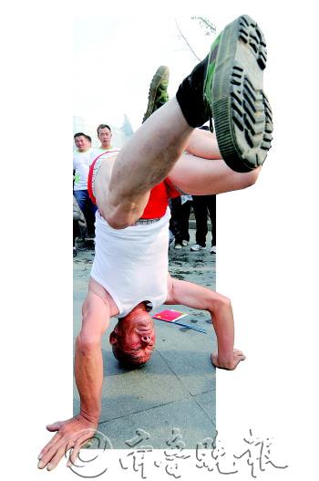 本报记者 周千清 |  | 老汉跑完玩倒立