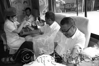 19日,一群的哥结伴来到市中心血站的献血车上献血。据了解,这群的哥为海博出租车公司的成员,在短短两个小时内,50名的哥共献血13300毫升。据了解,海博出租车公司的的哥们已连续五年组织爱心献血。