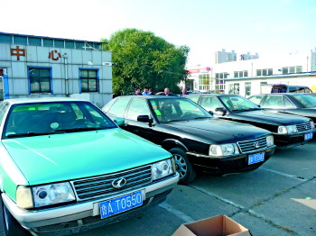 本月中旬开始,省城主城区6年营运期限到期的出租车开始集中办理旧车退市手续。为防止退市的出租车变身“黑出租”,旧车转籍过户前须改掉出租车的专用色。图为山东润华出租公司准备退旧的出租车和已经改色暂未过户的“出租车”。 本报记者 李飞 摄