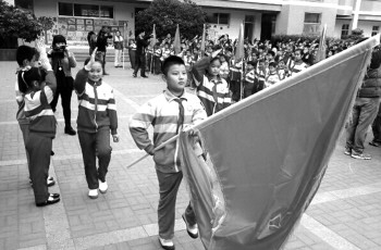 18日,济宁霍家街小学举行一年级新生的入队仪式,1000多名一年级学生加入中国少年先锋队。在仪式上,大队辅导员刘雅娜宣布了入队新生名单,由四年级的学生为他们戴上了鲜艳的红领巾。图为入队仪式现场。 本报记者 汪泷 通讯员 孙友贵 刘雅娜 摄影报道