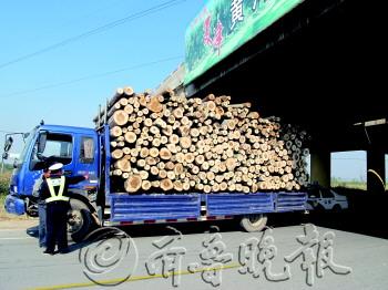 ◤21日上午,一辆超高、超载运输木材的大货车路过国道308线夏津县路段时,被巡逻民警查获,交警依法进行处罚。