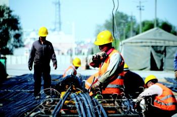 23日,市重点工程滨河路施工进度已进行大半,工人正在紧赶工期。钢筋工在搬运沉重的钢筋时,脸上挂满了汗珠。     本报记者 马志勇 摄