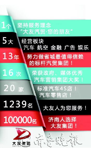 作为东风日产在济南地区的唯一授权经销商大友集团,保有车主本月突破100000人大关,集团公司迈入新的发展阶段。按照最新数据济南市区430万人的规模计算,平均每43人中,就用1人选择在大友集团购车。 本周六,集团公司将在5家东风日产4S店以及6家零售店同步开展“大友惠·大优惠”集团年度感恩节活动,东风日产“10款车型10重礼遇”活动空降泉城:50款总经理签售特价车、汽车用品1元起拍、奇骏和逍客0元置换专案、0元升级PM2.5空气净化系统、免费赠送每年60天出险代步车服务等多重惊喜等您现场揭晓。 在济南,选择东风日产的四大理由: 理由一:销售满意度第1名! 在J.D.Power亚太公司近期发布的“2013年中国销售服务满意度研究(SSI)”中显示,东风日产以732分的成绩获得全品牌冠军,更以领先奥迪11分的成绩,获得第一名! 理由二:五年节油1280L,省下10600元! 东风日产全大部分车型都采用了XTRONIC-CVT变速箱,优势尽显!第一,与传统的AT变速箱相比,节油近50%;第二,采用了钢带传动,使动力损耗几乎为0;第三,采用了ASC智能逻辑控制系统,提供1400种变速模式。5年可以实现节油1280L,省下10600元。 理由三:20%超低首付,史上最低门槛! 预算有限又想开好车,不要紧!骊威1.6万起、阳光1.4万起、骐达1.9万起、轩逸2.3万起、逍客2.5万起,无需资产抵押、无需单位证明、没有职业限制,同时购置税和保险费也可分期! 理由四:天籁首付50%、0月供、0利息! 活动期间天籁推出5050购车专案,享受12个月0利息、0月供。据悉目前地方性的融资贷款和银行理财有大概0.5-0.8分的利息,省下来的车款“钱生钱”还能再盈利近1万元! 本次活动,也可报名参加太平洋汽车和搜狐汽车网络媒体看车团,详细内容请关注东风日产济南区微信公共平台。 东风日产经十西路大友店 88880000 东风日产经十东路龙腾店 88882222 东风日产工业北路金大友店 82798888 东风日产二环南路银大友店 87580666 东风日产章丘大友明店 83788888