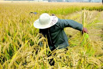 | 稻农在地里挥镰收割。 通讯员 厉晓伟 孙殿玉 摄 |