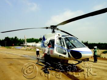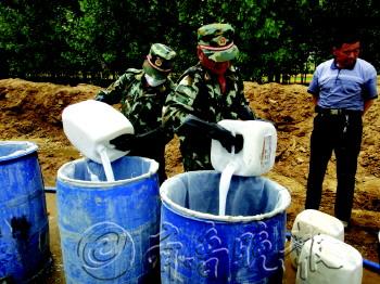 | 飞机洒药是对付美国白蛾的主要手段。杨林 摄 |  | 工作人员正在将灭幼脲加入稀释桶内。杨林 摄 |