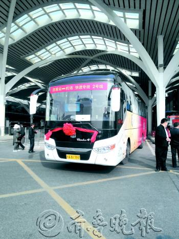见习记者 王皇 双向对发每小时一趟 27日上午10点,济南西客站至机场2号快速专线正式从济南西客站公交枢纽开出。记者在济南西客站公交枢纽站看到,中间候车区已立起了“西客站—机场快速专线2号线”站牌,站牌正面时刻表详细标示出每个班次在11个站点的到站时间;背面上半部分除写明西客站、机场起止点外,还在连接线上写明经十路,下半部分则附上了简易线路图,标示出各个站点。 依站牌所示,2号快速专线的起止点为济南西客站、济南遥墙机场,走经十路交通动脉,沿途设立济南西客站、段兴西路、营市街、五里牌坊、八一立交桥西、省体育中心、千佛山、燕山立交桥西、龙奥大厦北门、高新区管委会、济南遥墙国际机场11个站点。起止站首发车9:30发出,末班车则20:30开出,每小时一班。到达沿途各站牌所花时间也不一,最短的约5分钟,最长的则是高新区管委会与机场间的40分钟。 据济南市公交总公司旅游分公司营运管理部经理王尧介绍,该线营运里程60公里,配备6部11米半长45+1+1座高一级客车,实行全程一票制,票价25元。营运时间为9:30至20:30,每小时一班,双向对发,一天24班次。单程运营时间为2小时。据王尧介绍,快速公交2号线走公交专用道,所以运营时间受路面堵车因素的影响不大。 王尧告诉记者,本条线路串联了市区主要旅游景点、商业区、宾馆、医院、学校、交通换乘枢纽。运行周期为工作日、公休日、节假日天天发车,采用定点发车、准时到站、快速到达的运营方式,主要满足外地乘客和济南市民商务活动、旅游、出行及交通口岸换乘等需求。