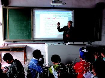 图为:龙山镇花崖小学刘相见老师在利用电子白板多媒体上课。