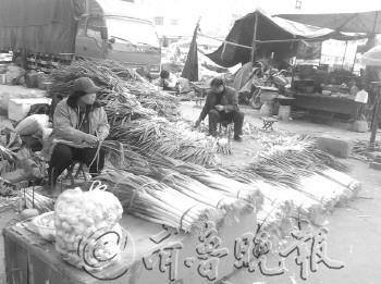 | 批发商正在整理大葱。 |