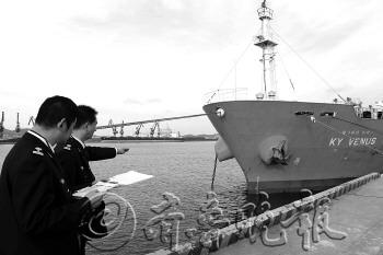 | 肇事韩国船接受海事调查。 通讯员 郝光亮 摄 |