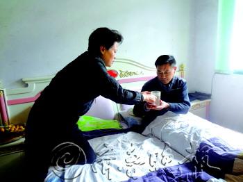 | 十三年如一日,何辉精心照料因车祸双目失明的丈夫。 |