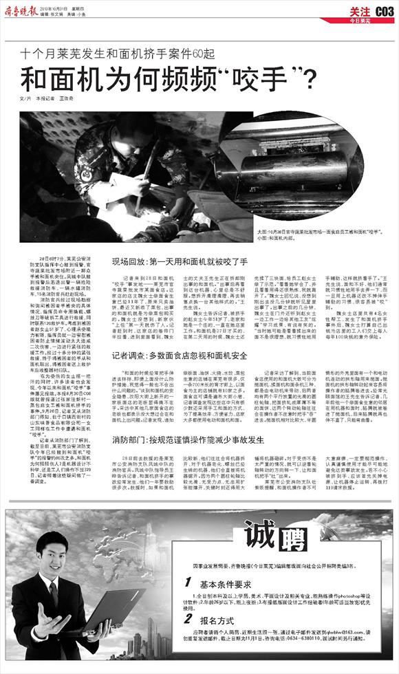 十个月莱芜发生和面机挤手案件60起 和面机为何频频“咬手”? 文/片 本报记者 王浩奇