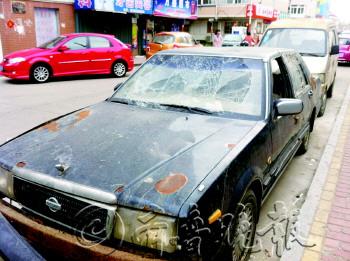 | 新世界花园北门停了一辆“僵尸车”。 本报记者 尹海涛 摄 |