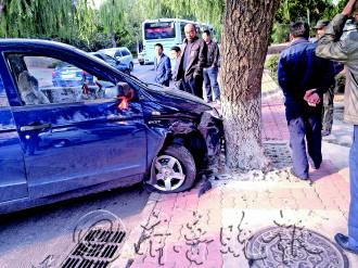 | 图为于先生的新车撞在了大树上。 见习记者 宫楠 摄 |