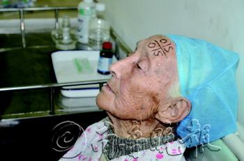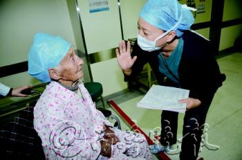 | ▲医生为老人讲解手术注意事项。 本报记者 姜文洁 摄 |  | 老人安静地等待手术,额头上是医生标注的左眼手术标志。 本报记者 姜文洁 摄 |