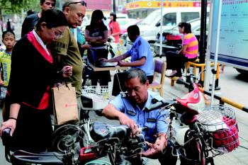 | 民警正在给电动车打码(资料片)。 本报记者 王鑫 摄 |