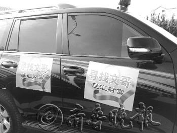 |  | ▲私家车贴着“寻找文哥”的启事。