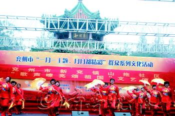 2日,兖州市人民乐园,新兖镇山拖社区文艺表演队举办“歌声嘹亮颂祖国”文艺演出活动,来自山拖社区的近40位演员表演了单扇秧歌舞《欢聚一堂》、京剧小合唱《红梅赞》等16个节目。他们以嘹亮的歌声、优美的舞姿表达了对祖国对家乡的热爱之情。图为演出现场。 本报见习记者 李晶 本报通讯员 杨福海 摄