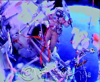 | 11月9日,美国国家航空航天局(NASA)提供的电视截屏展示了俄罗斯宇航员奥列格·科托夫手持火炬在太空行走。 新华社发