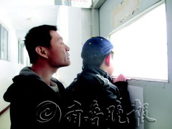 在烟台华侨学校,一名小学生正让爸爸抱着,透过窗户看看自己上课的新教室。 本报记者 林宏岩 摄