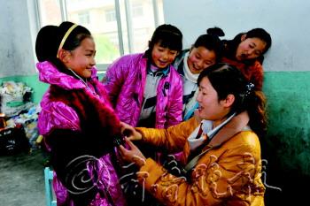 | 淄博银座商城工作人员给孩子们试穿过冬衣物,漂亮的新衣让学生们十分开心。 本报记者 王鸿哲 摄 |