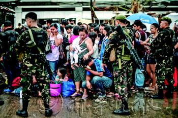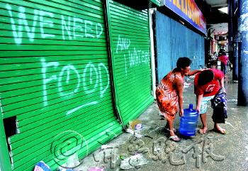 | 12日,在塔克洛班机场,一名妇女(中)在安慰因没有赶上撤离飞机而哭泣的亲属。 新华/法新 |  | 12日,救援人员在塔克洛班搬运遇难者遗体。 新华社发 |  | 12日,在塔克洛班,灾民抬着一桶饮用水经过关闭的店铺,店铺门上写着“我们需要食物和水”的字样。 新华/路透 |