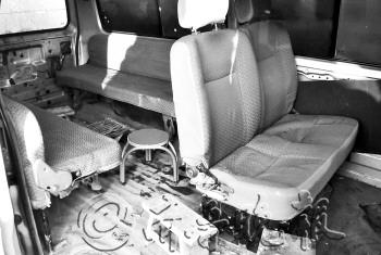 | 一辆面包车上塞满了人。本报记者 李岩松 摄 |  | 改装的面包车内部。本报记者 李岩松 摄 |
