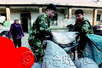 13日上午,在张店漫泗河村“阳光老人”妮娜家,张店区公安消防大队的消防队员将他们为老人购买的10袋煤卸到院子里,并为老人送上了两件崭新的棉衣。“阳光老人”妮娜的故事见报后引发全城爱心,大家捐款捐物,向老人伸出援手。前段时间,老人左眼的白内障得到了免费治疗,如今老人的取暖问题也有了着落。 本报记者 王鑫 摄影报道