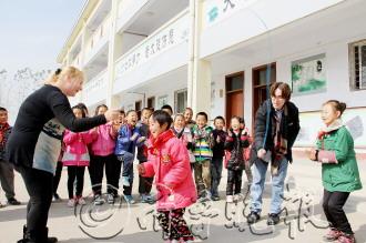 12日,峄城区阴平镇上郭小学迎来了两位洋教师,来自南非的Jani和来自美国Jim的两位外教走进学校社团。据悉,该区启动了教师城乡交流活动,城里学校教师到农村支教,通过自己的朋友定期聘请外教到该校活动。图为外教与小学生们一起做游戏。 本报通讯员 徐磊 李景钊 本报记者 杨霄 摄影报道