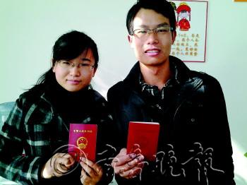 | 一对新人展示刚刚领到的结婚证。 见习记者 王富军 摄 |  | 领到证后迫不及待地查看。 见习记者 王富军 摄 |