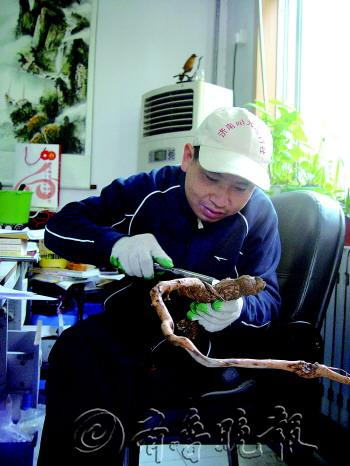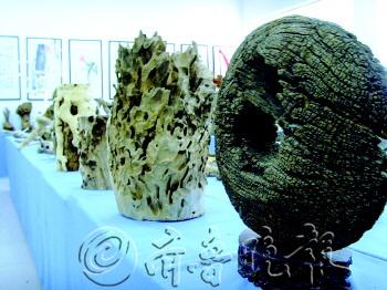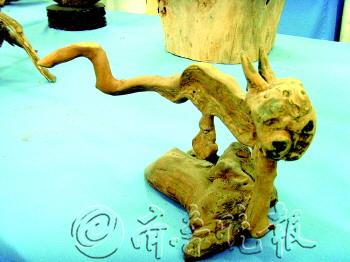 在济南高新区实验中学,有一间不寻常的教室。进入教室,扑鼻而来的是木材的天然味道,映入眼帘的是形态各异的根艺作品,这里就是盛朝宽的民俗根艺室。学校美术教师盛朝宽,看到了根艺的独特价值,组织学生成立了根艺社团,把它作为对美术特长生的辅助教学手段。现在,盛朝宽收集的根雕作品近2000件。 文/片 本报见习记者 任丽媛 小树根激发学生大兴趣 今年36岁的盛朝宽,1999年大学毕业后,被分配到高新区实验中学工作,至今已有14年了。盛朝宽籍贯是重庆市忠县,从四川一所美术院校毕业。学习美术设计的他,将自己的在校表现、美术作品做成了十几页的个人简历,希望能够到北京、上海这样的大城市发展。 “恰好济南市教委去学校选聘,我就来到了济南。当时又赶上城镇下派,就将我派到了历城四中,也就是现在的高新区实验中学。”盛朝宽说,“当时来到工作单位后,心理落差很大。上世纪90年代的济南东郊艺术教育相当薄弱,学校没有专职的美术教师,当时我都有回重庆的想法了。但是领导和同事的关心,让我这个外乡人感觉像回到自己家一样,我就决定留下来了。现在,学校三分之一的学生都是美术特长生,他们中的多数都能考上好大学。” 从最初的普通美术教师到现在学校艺术教育领头人,盛朝宽一直在不断探索和学习,希望更多地挖掘学生的艺术潜力。2010年,盛朝宽在带学生校外写生的过程中,看到村民用树根烧火。当时,他发现那些树根天然造型有独特的美感,就和学生们收集了一些树根带回去,学生们自己观察,根据自己心中所想的形象,将树根简单处理做成根雕,变废为宝。 “虽然我们学校的学生大部分来自农村,但是他们对美术相当有悟性。通过什么去培养他们的兴趣,挖掘他们的潜力,这很重要。那次野外写生带回来的树根,让我觉得能够激发学生对美术专业的兴趣,提高他们的专业水平,可以让单调的美术变得生动起来。”盛朝宽说。 “一次我的学生捡到一个树根,他总觉得像什么,可转眼一看又什么都不像。过了两天,他找到我说是像鹿,并且还看到他用小刀简单加工了一下。而且我发现他注重观察,对于一些事物总能比别人多些想法。这让我更坚定多方面培养学生的想法。”盛朝宽说,现在除了美术专业课之外,他还教学生摄影、陶艺、根雕等。对于根雕,盛朝宽自己就很感兴趣。 不起眼树根也有自然美 从2010年开始,盛朝宽就对根雕产生了极大的兴趣,加入济南东郊民俗根艺俱乐部后,进一步了解制作根雕的技巧。每逢节假日就去周边的村落、南部山区,在田间地头、陡峭山坡,去收集树根。“对树根感兴趣了,不自觉地就会关注。尤其是到了秋冬季,光秃秃的树根暴露在外面,更容易发现。”盛朝宽说,“寻找树根,本身就是对美的一种追寻。把树根挖回来,然后欣赏美、评价美,再把它打造为一件美的艺术品。” “不是每一次寻找都能带回宝贝”。盛朝宽有一次去长清,在万德镇一个垂直的山坡上,看到一个扎在缝隙中的树根,显露在外面特别漂亮。“怎么才能把它弄下来?当时我们同行的几个老师都犯愁了。看着不远,但站在下面够不着,从山坡上面也探不到。可把我急坏了。山坡垂直平滑,树根就在居中位置,没办法只能放弃了。”盛朝宽说,这样的树根,经常会碰到。有时候,为了一个有形的树根,他会去那个地方好几次。 在盛朝宽的眼中,每一件根雕作品都有美的形态。“这个像中国地图,我把它取名‘根在中国’。这个像一个人在呐喊,眼睛、鼻子、张大了的嘴巴,取名为‘呐喊’。”盛朝宽指着一件件根雕作品介绍着。“飞龙在天”、“根在中国”、“火炬”、“呐喊”、“舞”、“盼”、“韵”等等一件件根雕作品摆放在民俗根艺馆内,让人遐想悠悠。 “根雕作品除了美的形态之外,每一件作品背后都有它的故事。”盛朝宽拿起一个T字形的树根,上宽约20厘米、下长约35厘米,交汇处长出一些树根盘结着,形成一个圆孔。“这个是2010年冬天,我去四川亲戚家带回来的。看见它的时候,只有T字那一横,我拽了半天,拽出来了,原来还有半截,当时挖它的时候,可把我吓坏了,没想到在圆孔处有一条蛇,原来是蛇在里面冬眠。” 四年收集根雕作品近2000件 从2010年至今,盛朝宽和学生们收集的根雕作品已经近2000件。在民俗根艺馆内整整齐齐地摆放着一件件根雕作品,连盛朝宽的办公室内,也摆满了形态各异的根雕。“这些根雕都是天然之态,没有经过多少雕刻,它本身的自然性就是一种美。”盛朝宽说。这些木头或是平滑,或是凹凸不平,纹理斑驳、色彩天成、姿态迥异。 在他的办公室内,整齐地摆放着制作根雕的工具,雕刻刀、雕磨机、电钻等。“这些工具都很少用到,就只在去皮时用得比较多。现在,我也就是广泛地收集树根,看到有模有样的就带回来,简单处理一下。如果有精力和资金,我会把这些根雕进行再加工。比如,有的根雕已具有天然的形态,它打上蜡之后更有光泽。有的木头有色彩感,但是没有样子,那我在木头上刻个东西,它就能更有价值。”盛朝宽说。 除了根雕之外,盛朝宽还在其他很多方面都有所涉猎。摄影、陶艺、设计、盆景等等,在学校老师的眼中,盛朝宽是能人。“美术专业精通不说,学校许多文字性的工作也是他做,学校的宣传册、展板每次也是他制作的,连学校学生用的美术教材都是盛老师编辑的。”高新区实验中学