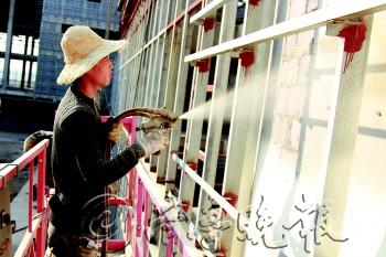 | 工人正在对市文化中心建筑物墙体喷涂保温材料,帽子上已经沾满了涂料。 |