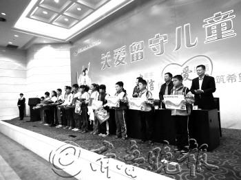 在“牵手农信伴成长,播撒爱心筑希望”活动启动仪式上,留守儿童领到新书包和爱心捐款。